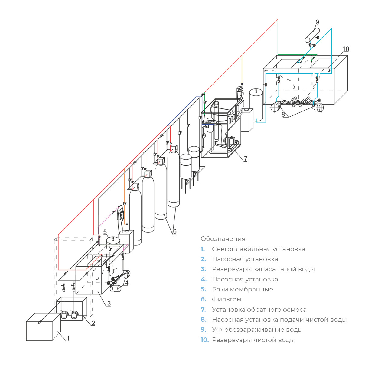 Станция добычи воды «СНЕЖИЦА» предназначена для получения питьевой воды из снега в зимний сезон и из речной воды - в летний сезон.